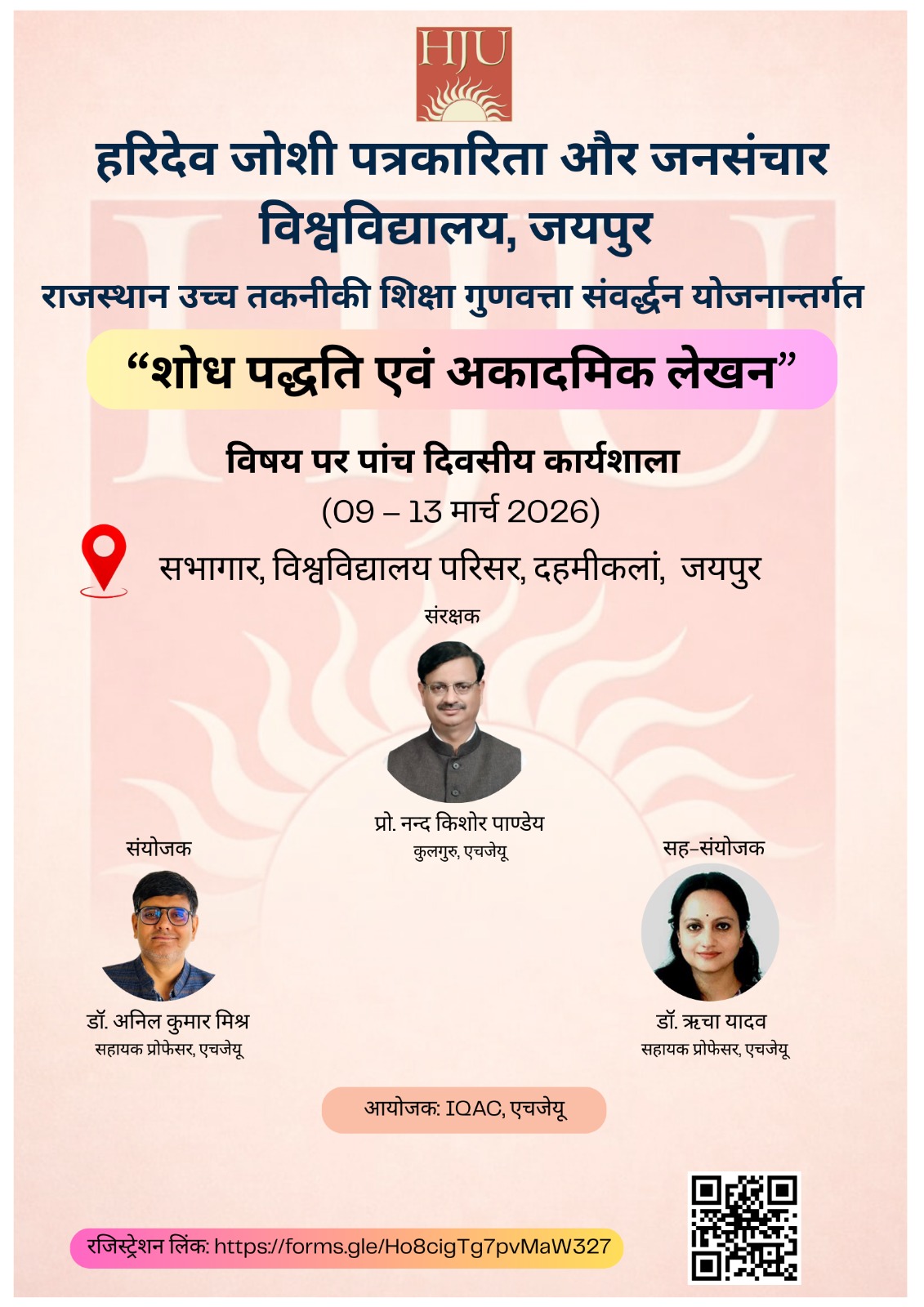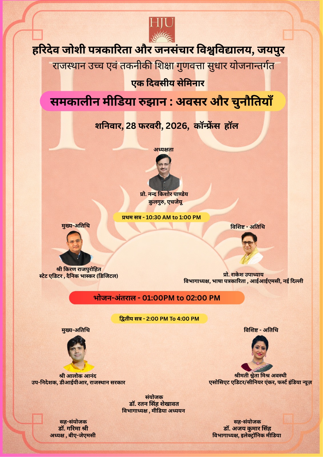 मीडिया और जनसंचार के लगातार बढ़ते हुए आकार, विविधता और अर्थ-बहुलता के दौर में राजस्थान सरकार द्वारा हरिदेव जोशी पत्रकारिता और जनसंचार विश्वविद्यालय (एचजेयू) की स्थापना को एक अत्यंत महत्त्वपूर्ण क़दम के रूप में याद रखा जाएगा। वस्तुस्थिति यह है कि हमारे शैक्षिक संस्थानों में मीडिया के क्षेत्र में उभरे नये अभिरूपों और नवाचारों के अध्ययन-अध्यापन की कोई विधिवत् व्यवस्था मौजूद नहीं है। राजस्थान विधानमंडल के अधिनियम संख्या 11, वर्ष 2019 के अंतर्गत गठित यह विश्वविद्यालय मीडिया-अध्ययन के क्षेत्र में इसी अभाव की पूर्ति के लिए प्रतिबद्ध है।